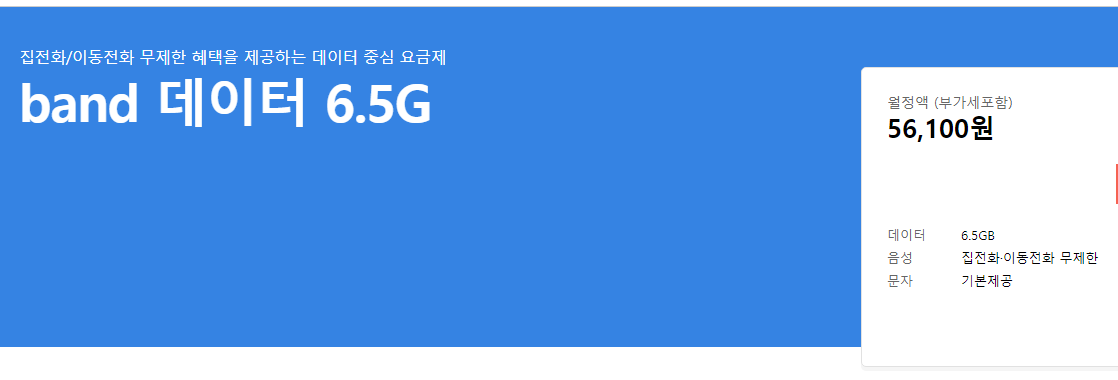 sk T티월드 band 데이터 6.5G 요금제는 집전화/이동전화 무제한 혜택을 제공하는 데이터 중심 요금제입니다.