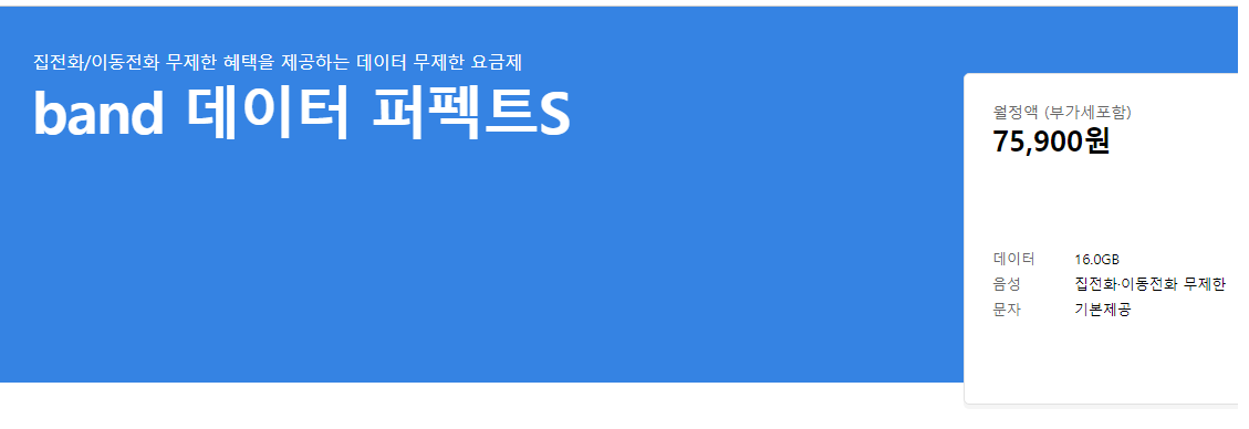 SK텔레콤 T월드 band 데이터 퍼펙트S 요금제는 집전화/이동전화 무제한 혜택을 제공하는 데이터 무제한 요금제이며, 음성 집전화·이동전화 무제한 이용할 수 있으며, 문자 기본 제공됩니다.