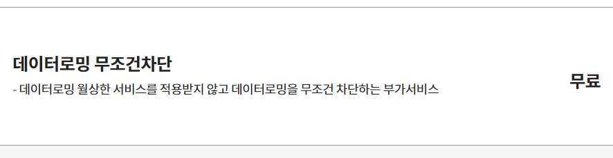 - 데이터로밍 월상한 서비스를 적용받지 않고 데이터로밍을 무조건 차단하는 부가서비스입니다.