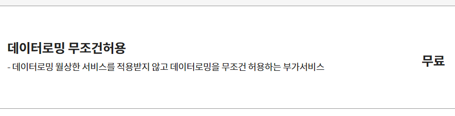 - 데이터로밍 월상한 서비스를 적용받지 않고 데이터로밍을 무조건 허용하는 부가서비스입니다.
