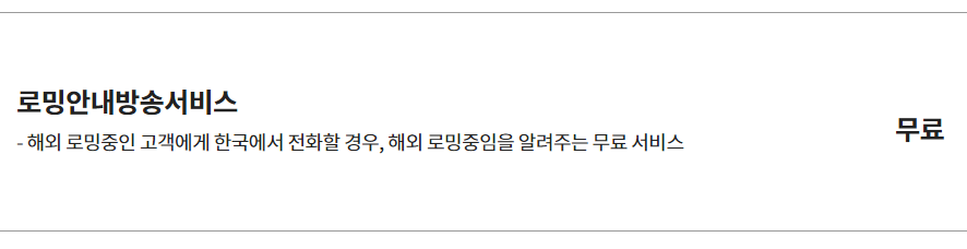- 해외 로밍중인 고객에게 한국에서 전화할 경우, 해외 로밍중임을 알려주는 무료 서비스입니다.