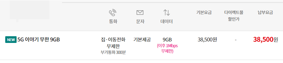 큰사랑 [이야기 알뜰폰 skt망 5G 요금제] 5G 이야기 무한 9GB 요금제는 집/이동전화 음성 무제한이며, 문자 기본제공되며, 데이틑 9GB 제공되며, 소신시는 최대 1Mbps의 속도로 무제한 이용가능한 요금제입니다.