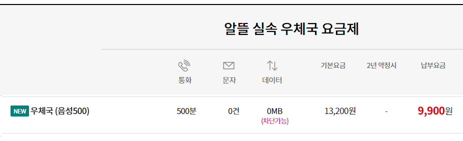 큰사랑 [이야기 알뜰폰 SKT망] 우체국(음성 500) 요금제는 음성통화 500분 제공되며, 이용요금은 4월 1일 부터 별도 공지시 까지 매월 3,300원 프로모션 할인 적용되어 월9,900원(부가세포함)입니다.