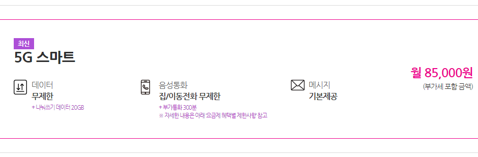 LGU+ 5G 스마트 요금제는 데이터 완전 무제한이며, 나눠쓰기 데이터 20GB제공되고, 음성통화 집/이동전화 무제한입니다.