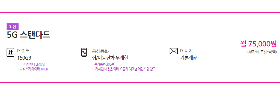 LGU+ 5G 스탠다드 요금제는 데이터 150GB제공되며. 다 쓰면 최대 5Mbps 속도로 데이터를 무제한 이용할 수 있으며, 나눠쓰기 데이터 10GB 제공됩니다.