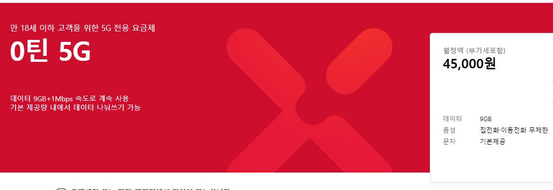 [SKT] 0틴 5G 요금제는 데이터 9GB 제공되며, 소진 후 최대 1Mbps 속도로 계속 사용할 수 있므며, 기본 제공량 내에서 데이터 나눠쓰기 가능합니다.
