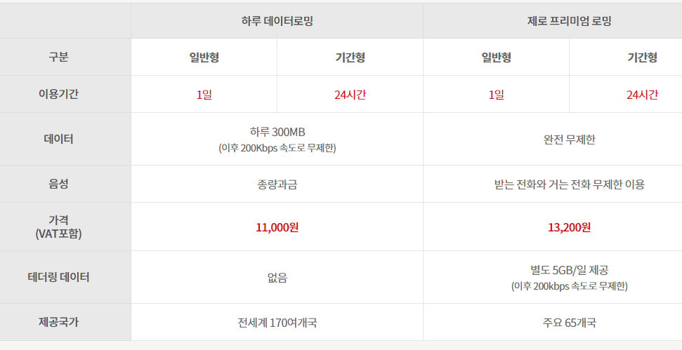 해외로밍 요금제 안내.