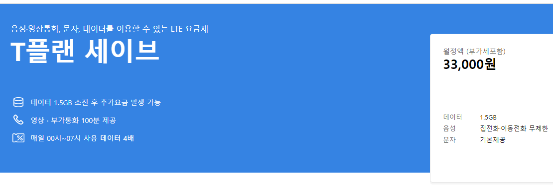 T월드 [SKT] T플랜 세이브 요금제는 데이터 1.5GB 소진 후 추가요금 발생 가능하며, 영상 · 부가통화 100분 제공됩니다.